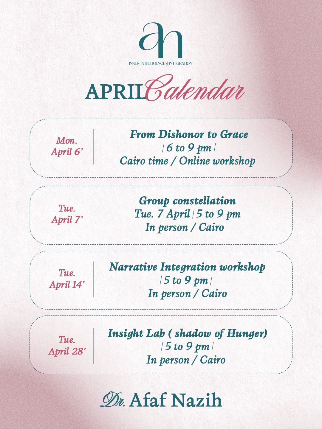 "Dr. Afaf has a profound sense of sincerity and integrity. Her gift of seeing beyond the ordinary together with her intention to fully serve allows her to be an extraordinary family constellations facilitator. She holds a space of strength and love which enables phenomenal resolve to take place. "